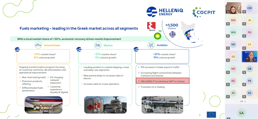 Thanks to our colleagues at HELLENIQ Energy Papageorgiou Michaela, we had the opportunity to present SAF and Marine Fuels: Industry Reflections on Market Readiness and Strategic Challenges (COCPIT Project).